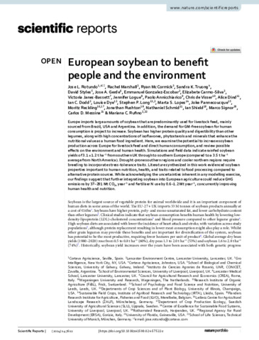 Europe imports large amounts of soybean that are predominantly used for livestock feed, mainly sourced from Brazil, USA and Argentina. In addition, the demand for GM-free soybean for human consumption is project to increase. Soybean has higher protein quality and digestibility than other legumes, along with high concentrations of isoflavones, phytosterols and minerals that enhance the nutritional value as a human food ingredient. Here, we examine the potential to increase soybean production across Europe for livestock feed and direct human consumption, and review possible effects on the environment and human health. Simulations and field data indicate rainfed soybean yields of 3.1 ± 1.2 t ha−1 from southern UK through to southern Europe (compared to a 3.5 t ha−1 average from North America). Drought-prone southern regions and cooler northern regions require breeding to incorporate stress-tolerance traits. Literature synthesized in this work evidenced soybean properties important to human nutrition, health, and traits related to food processing compared to alternative protein sources. While acknowledging the uncertainties inherent in any modelling exercise, our findings suggest that further integrating soybean into European agriculture could reduce GHG emissions by 37–291 Mt CO2e year−1 and fertiliser N use by 0.6–1.2 Mt year−1, concurrently improving human health and nutrition.