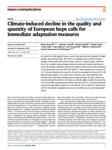 A recent rise in the global brewery sector has increased the demand for high quality, late summer hops. The effects of ongoing and predicted climate change on the yield and aroma of hops, however, remain largely unknown. Here, we combine meteorological measurements and model projections to assess the climate sensitivity of the yield, alpha content and cone development of European hops between 1970 and 2050 CE, when temperature increases by 1.4 °C and precipitation decreases by 24 mm. Accounting for almost 90% of all hop-growing regions, our results from Germany, the Czech Republic and Slovenia show that hop ripening started approximately 20 days earlier, production declined by almost 0.2 t/ha/year, and the alpha content decreased by circa 0.6% when comparing data before and after 1994 CE. A predicted decline in hop yield and alpha content of 4–18% and 20–31% by 2050 CE, respectively, calls for immediate adaptation measures to stabilize an ever-growing global sector.
