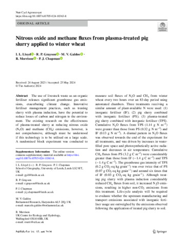 The use of livestock waste as an organic fertiliser releases significant greenhouse gas emissions, exacerbating climate change. Innovative fertiliser management practices, such as treating slurry with plasma induction, have the potential to reduce losses of carbon and nitrogen to the environment. The existing research on the effectiveness of plasma-treated slurry at reducing nitrous oxide (N2O) and methane (CH4) emissions, however, is not comprehensive, although must be understood if this technology is to be utilised on a large scale. A randomised block experiment was conducted to measure soil fluxes of N2O and CH4 from winter wheat every two hours over an 83-day period using automated chambers. Three treatments receiving a similar amount of plant-available N were used: (1) inorganic fertiliser (IF); (2) pig slurry combined with inorganic fertiliser (PS); (3) plasma-treated pig slurry combined with inorganic fertiliser (TPS). Cumulative N2O fluxes from TPS (1.14 g N m−2) were greater than those from PS (0.32 g N m−2) and IF (0.13 g N m−2). A diurnal pattern in N2O fluxes was observed towards the end of the experiment for all treatments, and was driven by increases in water-filled pore space and photosynthetically active radiation and decreases in air temperature. Cumulative CH4 fluxes from PS (3.2 g C m−2) were considerably greater than those from IF (− 1.4 g C m−2) and TPS (− 1.4 g C m−2). The greenhouse gas intensity of TPS (0.2 g CO2-eq kg grain−1) was over twice that of PS (0.07 g CO2-eq kg grain−1) and around six times that of IF (0.03 g CO2-eq kg grain−1). Although treating pig slurry with plasma induction considerably reduced CH4 fluxes from soil, it increased N2O emissions, resulting in higher non-CO2 emissions from this treatment. Life-cycle analysis will be required to evaluate whether the upstream manufacturing and transport emissions associated with inorganic fertiliser usage are outweighed by the emissions observed following the application of treated pig slurry to soil.