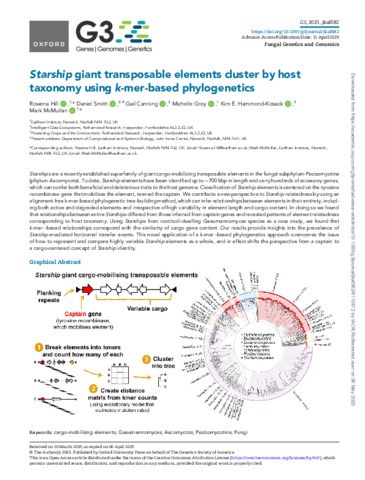 SUMMARY We applied a kmer-based phylogenetic classification approach to giant Starship cargo-mobilising elements from species across the Pezizomycotina (Ascomycota, Fungi). We found Starship elements to frequently cluster according to host taxonomy, suggesting horizontal transfer of elements is less common across larger evolutionary distances. Kmer-based phylogenetics approaches show promise for both element classification and to inform our understanding of the evolution of Starships and other giant cargo-mobilising elements.