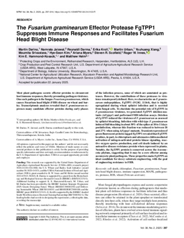 | Additional information | FUNDING This research was supported by the United States Department of Agriculture, Agricultural Research Service (USDA-ARS) research project 5020-21220-014-00D, the U.S. Wheat and Barley Scab Initiative (award number 58-5020-0-013), and the USDANational Institute of Food and Agriculture (NIFA) grant awarded to R. Innes and M.Helm (award number 2022-67013-38265). R. Darma is supported by a grant from the Biotechnology and Biological Sciences Research Council (BBSRC) (BB/X012131/1). Additional funding to support K. Hammond-Kosack, M. Urban and M. Darino has been provided by the BBSRC Institute Strategic Programme (ISP) Grants Designing Future Wheat (BBS/E/C/000I0250) and Delivering Sustainable Wheat (BB/X011003/1 and BBS/E/RH/230001B) and the BBSRC grant (BB/X012131/1). E. Kroll is supported by the BBSRC-funded South West Biosciences Doctoral Training Partnership(BB/T008741/1). |