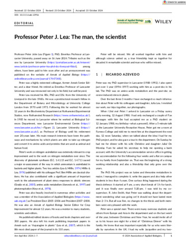 Editorial Professor Peter John Lea (Figure 1), PhD, Emeritus Professor at Lancaster University, passed away on 16 June 2024. Tributes such as the one by Lancaster University (https://portal.lancaster.ac.uk/intranet/news/article/professor-peter-lea-phd-dsc-liverpool-fibiol), among others, have been paid to him soon after and an announcement was published on the website of Annals of Applied Biology (https://onlinelibrary.wiley.com/journal/17447348).