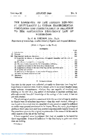 The longevity of the fasting bed-bug (C. lectularius L.) under experimental conditions and particularly in relation to the saturation deficiency law of water-loss.