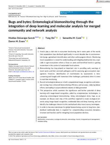 Insects play a vital role in ecosystem functioning, but in some parts of the world, their populations have declined significantly in recent decades due to environmental change, agricultural intensification and other anthropogenic drivers. Monitoring insect populations is crucial for understanding and mitigating biodiversity loss, especially in agro-ecosystems where a focus on pests and beneficial insects is gaining momentum in the context of sustainable food systems. Biomonitoring has long played an important role in providing early warnings of insect pests and their vectored pathogens and for assessing agro-ecosystem management. However, identification of invertebrates by taxonomists is time-consuming and fraught with numerous other challenges, particularly when it comes to real-time monitoring. Recent technological advances in both computational image recognition and molecular ecology have enhanced biomonitoring efficiency and accuracy, reducing labour efforts, but leading to unprecedented volumes of data generated. This perspective article examines the significance and further potential of deep learning with image-based recognition, aided by complementary technologies, in advancing entomological biomonitoring. Using entomological sticky traps as an example, we discuss each step of the workflow required to create ecological networks using image-based recognition, multimodal data and deep learning, and we identify the challenges inherent to this method and other insect survey techniques. In order to become mainstream for global biomonitoring, access to long-term, standardised multimodal data is required for comprehending ecosystem dynamics, structure and function and for mitigating insect population declines.