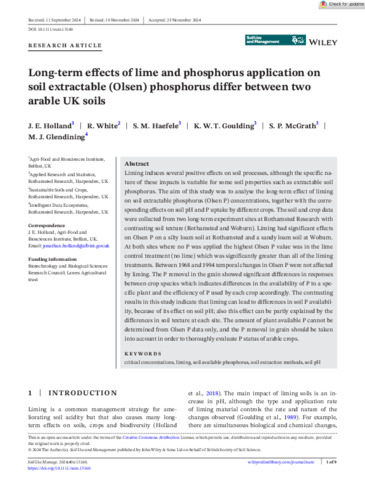 Long-term effects of lime and phosphorus application on soil extractable (Olsen) phosphorus differ between two arable UK soils