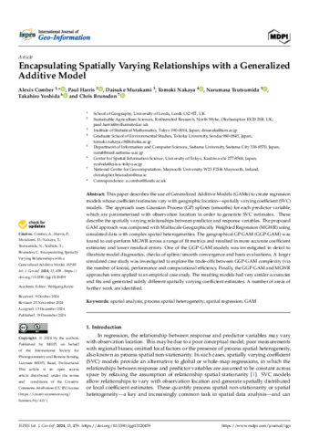 Abstract: This paper describes the use of Generalized Additive Models (GAMs) to create regression models whose coefficient estimates vary with geographic location—spatially varying coefficient (SVC) models. The approach uses Gaussian Process (GP) splines (smooths) for each predictor variable, which are parameterised with observation location in order to generate SVC estimates. These describe the spatially varying relationships between predictor and response variables. The proposed GAM approach was compared with Multiscale Geographically Weighted Regression (MGWR) using simulated data with complex spatial heterogeneities. The geographical GP GAM (GGP-GAM) was found to out-perform MGWR across a range of fit metrics and resulted in more accurate coefficient estimates and lower residual errors. One of the GGP-GAM models was investigated in detail to illustrate model diagnostics, checks of spline/smooth convergence and basis evaluations. A larger simulated case study was investigated to explore the trade-offs between GGP-GAM complexity (via the number of knots), performance and computational efficiency. Finally, the GGP-GAM and MGWR approaches were applied to an empirical case study. The resulting models had very similar accuracies and fits and generated subtly different spatially varying coefficient estimates. A number of areas of further work are identified.