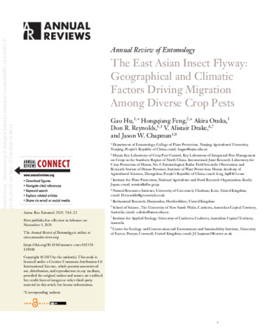 he East Asian Insect Flyway is a globally important migration route stretching from the Indochina Peninsula and the Philippines through East China to Northeast China and northern Japan, although most migrants utilize only part of the flyway. In this review, we focus on long-range windborne migrations of lepidopteran and planthopper pests. We outline the environment in which migrations occur, with emphasis on the seasonal atmospheric circulations that influence the transporting wind systems. Northward movement in spring is facilitated by favorable prevailing winds, allowing migrants to colonize vast areas of East Asia. Migrants may be subject to contemporary natural selection for long flights as succeeding generations progressively advance northward. Overshooting into far northern areas from which there is little chance of return seems common in planthoppers. Moths are less profligate and have evolved complex flight behaviors that can facilitate southward transport in autumn, although timely spells of favorable winds may not occur in some years.