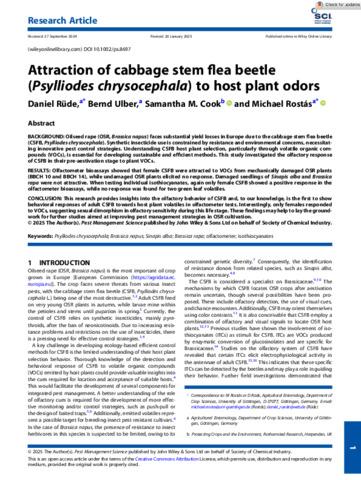 CONCLUSION This research provides insights into the olfactory behavior of CSFB and, to our knowledge, is the first to show behavioral responses of adult CSFB towards host plant volatiles in olfactometer tests. Interestingly, only females responded to VOCs, suggesting sexual dimorphism in olfactory sensitivity during this life stage. These findings may help to lay the groundwork for further studies aimed at improving pest management strategies in OSR cultivation. © 2025 The Author(s). Pest Management Science published by John Wiley & Sons Ltd on behalf of Society of Chemical Industry.