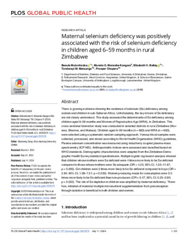 Maternal selenium deficiency was positively associated with the risk of selenium deficiency in children aged 6–59 months in rural Zimbabwe