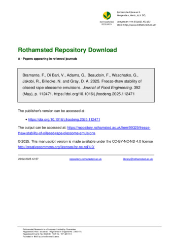 This work investigated the stability of natural oleosome emulsions on freeze-thawing. Oleosomes were recovered from oilseed rape seeds following an aqueous extraction process using sodium bicarbonate (0.1 M). The final emulsions pH was adjusted to 9, 6 and 3 to achieve surface charge values of −50.3 ± 1.6, −20.0 ± 2.4, and +37.5 ± 0.5 mV, respectively. The emulsions with lipid mass fraction of 0.28 ± 0.02 were cooled to −20 °C for up to 24 h and thawed at 20 °C for 18 h, and their freeze-thaw stability assessed quantifying amount of released oil (oil yield) due to emulsion destabilisation. The destabilisation of the oleosome emulsions at pH 9 and 6 increased with isothermal holding time at −20 °C, whereas the emulsion at pH 3 destabilised more rapidly. Differential scanning calorimetry analysis of emulsions cooled from 20 °C to −20 °C at −10 °C/min, and held at −20 °C for 8h, revealed how the continuous phase rapidly crystallised on cooling, whereas lipid crystallisation started after 2 h at −20 °C and continued for the following 3 h. Oil yield data combined with differential scanning calorimetry curves suggest that the oleosome emulsions at pH 9 and 6 destabilised along with crystallisation of the dispersed lipid phase, whereas emulsions at pH 3 destabilised with the continuous phase crystallisation. It was hypothesised that oleosome emulsions at pH 9 and 6 ruptured by a mechanism of partial coalescence. At pH 3 the electrostatic interaction between phospholipids and oleosin molecules, the main components of oleosome interface, may be reduced resulting in a weaker interface which on cooling can be easily disrupted by ice crystals. Oil yield data for emulsions with increasing continuous phase mass fraction (0.50 and 0.70) suggest a lower extent of destabilisation than control (0.28 continuous phase). Increasing the number of freeze-thaw cycles from one to three did not cause significant increase in the oil yield.