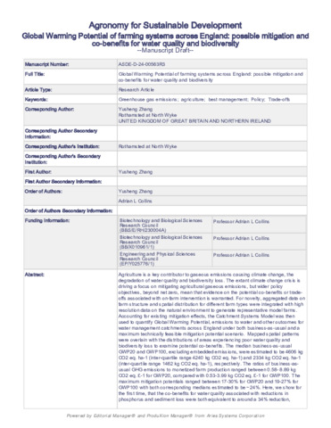 Global Warming Potential of farming systems across England: possible mitigation and co-benefits for water quality and biodiversity