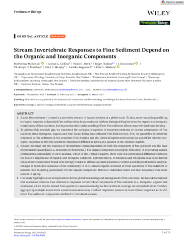 ABSTRACT 1. Excess fine sediment (<2mm) is a pervasive stressor of aquatic systems at a global scale. To date, most research quantifying ecological response to deposited fine sediment has been conducted without distinguishing between the organic and inorganic components of fine sediment, leaving mechanistic understanding of how fine sediment affects macroinvertebrates lacking. 2. To address this research gap, we examined the ecological responses of macroinvertebrates to various components of fine sediment stress (inorganic, organic and total mass). Using data collected from field surveys, first, we quantified invertebrate responses to fine sediment in two countries: New Zealand and the United Kingdom and second, we quantified whether ecological responses to the fine sediment components differed in spring and autumn in the United Kingdom. 3. Results indicated that the response of invertebrates varied dependent on both the component of fine sediment and the facet of community quantified (i.e., taxonomic or functional). The organic component was highly influential in structuring aquatic communities, particularly in New Zealand, whilst in the United Kingdom, there were less pronounced differences between the relative importance of organic and inorganic sediment. Ephemeroptera, Trichoptera and Plecoptera taxa (and derived indices) were consistently found to be strongly related to all fine sediment gradients. Further, according to threshold analysis, changes in taxonomic measures of the community in the United Kingdom occurred at lower quantities of fine sediment in autumn than in spring, particularly for the organic component. However, individual taxon and trait responses were more evident in spring. 4. Our study highlights several implications for the global monitoring and management of fine sediment. We have demonstrated that macroinvertebrates have distinctive responses to individual components of fine sediment (i.e., inorganic, organic and total mass) which may be missed from qualitative assessments of gross fine sediment coverage on streambeds alone. Further, aggregating multiple seasons into annual assessments may overlook important nuances in invertebrate responses to the different fine sediment components exhibited in individual seasons