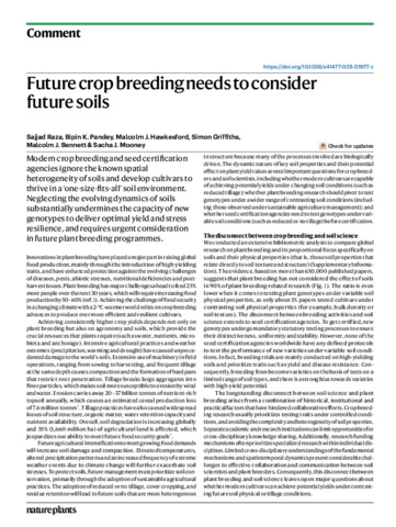 Comment Section Modern crop breeding and seed certification agencies ignore the known spatial heterogeneity of soils and develop cultivars to thrive in a ‘one-size-fits-all’ soil environment. Neglecting the evolving dynamics of soils substantially undermines the capacity of new genotypes to deliver optimal yield and stress resilience, and requires urgent consideration in future plant breeding programmes.