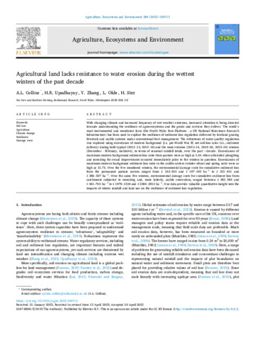 With changing climate and increased frequency of wet weather extremes, increased attention is being directed towards understanding the resilience of agroecosystems and the goods and services they deliver. The world’s most instrumented and monitored farm (the North Wyke Fam Platform - a UK National Bioscience Research Infrastructure) has been used to explore the resilience of sediment loss regulation delivered by lowland grazing livestock and arable systems under conventional best management. The robustness of water quality regulation was explored using exceedance of modern background (i.e. pre-World War II) net soil loss rates (i.e., sediment delivery) during both typical (2012–13, 2015–16) and the most extreme (2013–14, 2019–20, 2023–24) winters (December - February, inclusive), in terms of seasonal rainfall totals, over the past decade. Exceedances of maximum modern background sediment loss rates from pasture were as high as 2.4X when scheduled ploughing and reseeding for sward improvement occurred immediately prior to the winters in question. Exceedances of maximum modern background sediment loss rates in the arable system (winter wheat and spring oats) were as high as 21.7X. Over the five monitored winters, the environmental damage costs for cumulative sediment loss from the permanent pasture system ranged from £ 163–203 and £197–245 ha−1 to £ 321–421 and £ 386–507 ha−1. Over the same five winters, environmental damage costs for cumulative sediment loss from catchments subjected to reseeding and, more latterly, arable conversion, ranged between £ 382–584 and£ 461–703 ha−1 to £ 1978–2334 and £ 2384–2812 ha−1. Our data provide valuable quantitative insight into the impacts of winter rainfall and land use on the resilience of sediment loss regulation.