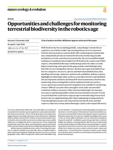 With biodiversity loss escalating globally, a step-change is needed in our capacity to accurately monitor species populations across ecosystems. Robotic and autonomous systems (RAS) offer technological solutions that may significantly advance terrestrial biodiversity monitoring, but this potential is yet to be considered systematically. We used a modified Delphi technique to synthesise knowledge from 98 biodiversity and 31 RAS experts from around the world, identifying the major methodological barriers that currently hinder monitoring, and exploring the opportunities and challenges that RAS offer to overcome these barriers. Biodiversity experts identified four barrier categories: site access, species/individual identification, data handling/storage and power/network availability. RAS experts highlighted currently available technologies and capabilities that could overcome these barriers. Some existing RAS could be optimised relatively easily to survey species, but would require development to monitor more ‘difficult’ taxa and be robust enough to work in the uncontrolled, and often extreme, conditions within ecosystems. Other nascent technologies (e.g., novel sensors, biodegradable robots) need accelerated research. Overall, it was felt that RAS could lead to major progress in monitoring terrestrial biodiversity by supplementing, rather than supplanting, existing methods. Transdisciplinarity needs to be fostered between biodiversity and RAS experts, so future ideas and technologies can be co-developed effectively.