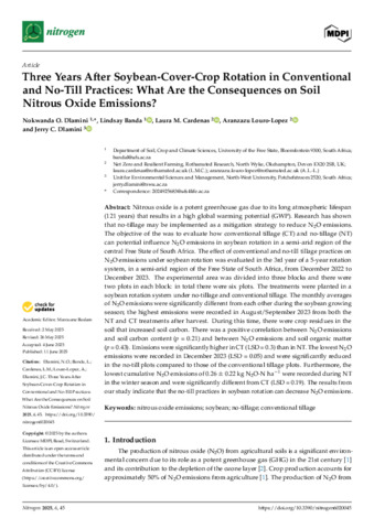 Nitrous oxide is a potent greenhouse gas due to its long atmospheric lifespan (121 years) that results in a high global warming potential (GWP). Research has shown that no-tillage may be implemented as a mitigation strategy to reduce N2O emissions. The objective of the was to evaluate how conventional tillage (CT) and no-tillage (NT) can potential influence N2O emissions in soybean rotation in a semi-arid region of the central Free State of South Africa. The effect of conventional and no-till tillage practices on N2O emissions under soybean rotation was evaluated in the 3rd year of a 5-year rotation system, in a semi-arid region of the Free State of South Africa, from December 2022 to December 2023. The experimental area was divided into three blocks and there were two plots in each block: in total there were six plots. The treatments were planted in a soybean rotation system under no-tillage and conventional tillage. The monthly averages of N2O emissions were significantly different from each other during the soybean growing season; the highest emissions were recorded in August/September 2023 from both the NT and CT treatments after harvest. During this time, there were crop residues in the soil that increased soil carbon. There was a positive correlation between N2O emissions and soil carbon content (p = 0.21) and between N2O emissions and soil organic matter (p = 0.43). Emissions were significantly higher in CT (LSD = 0.3) than in NT. The lowest N2O emissions were recorded in December 2023 (LSD = 0.05) and were significantly reduced in the no-till plots compared to those of the conventional tillage plots. Furthermore, the lowest cumulative N2O emissions of 0.26 ± 0.22 kg N2O-N ha−1 were recorded during NT in the winter season and were significantly different from CT (LSD = 0.19). The results from our study indicate that the no-till practices in soybean rotation can decrease N2O emissions.