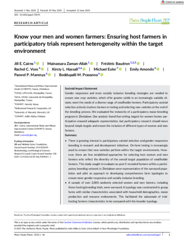 Societal Impact Statement Gender responsive and more socially inclusive breeding strategies are needed toensure new crop varieties, which offer greater yields in an increasingly variable cli-mate, meet the needs of a diverse range of smallholder farmers. Participatory varietalselection actively involves farmers in testing and selecting new varieties at the end ofthe breeding process. We evaluated the inclusivity of a participatory maize breedingprogram in Zimbabwe. Our analysis found that setting targets for women farmer par-ticipation ensured adequate representation, but participatory research should movebeyond simple targets and ensure the inclusion of different types of women and menfarmers. Summary • There is growing interest in participatory varietal selection and gender-responsivebreeding in research and development initiatives. On-farm testing is increasinglyused to ensure that new varieties perform within the target environments. How-ever, there are few established approaches for selecting host women and menfarmers who reflect the diversity of the overall target population of smallholderfarmers. This study sought to evaluate ex-post if recruited farmers within a partici-patory breeding network in Zimbabwe were representative of the surveyed popu-lation and pilot an approach to developing comprehensive farm typologies toensure more gender-responsive and socially inclusive breeding. • A sample of over 2,000 randomly selected women and men farmers, includingthose hosting breeding trials, were surveyed. A typology was constructed to groupfarms with similar characteristics associated with household demographics, maizeproduction and resource endowments. This facilitated the subsample of trial-hosting farmers characteristics to be compared with the broader typology. • The distribution of farm types selected by extension agents to host trials closelyreflected the distribution of farm types within the surveyed population. Two farmtypes associated with women household heads and three types associated withmen-headed households were identified, highlighting the heterogeneity withinthese groups. Other important factors of differentiation included farm assets, live-stock ownership and maize production features. • Sampling strategies that explicitly incorporate agronomic and socio-economicdiversity within the target population should be used in the selection of hostwomen and men farmers for participatory research to ensure appropriate gender and social inclusion.