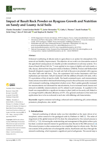 Enhanced weathering of silicate rocks in agriculture is an option for atmospheric CO2 removal and fertility improvement. The objective of our work is to characterise some of the agricultural consequences of a basaltic powder amendment on soil-crop systems. Two doses of basalt (80 and 160 t ha−1) were applied to two types of slightly acid soils (sandy or silty clayey), derived from long-term trials at Bordeaux (INRAE, France) and Rothamsted Research (England), respectively. For each soil, half of the pots were planted with ryegrass; the other half were left bare. Thus, the experiment had twelve treatments with four replications per treatment. Soil pH increased with the addition of basalt (+0.8 unit), with a 5% equivalence of that of reactive chalk. The basalt contained macro- and micronutrients. Some cations extractable in the basalt before being mixed to the soil became more extractable with increased weathering, independent of plant cover. Plant uptake generally increased for macronutrients and decreased for micronutrients, due to increased stock (macro) and reduced availability (micronutrients and P), related to pH increases. K supplied in the basalt was responsible for a significant increase in plant yield on the sandy soil, linked to an average basalt K utilisation efficiency of 33%. Our general conclusion is that rock dust applications have to be re-evaluated at each site with differing soil characteristics.