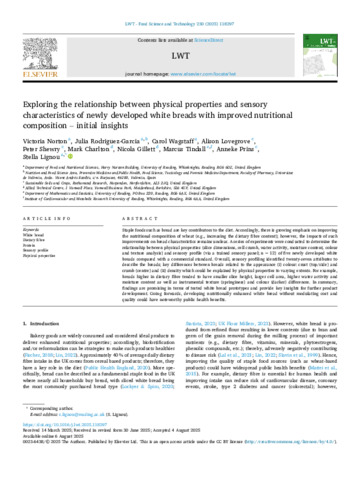 Staple foods such as bread are key contributors to the diet. Accordingly, there is growing emphasis on improving the nutritional composition of wheat (e.g., increasing the dietary fibre content); however, the impacts of such improvements on bread characteristics remains unclear. A series of experiments were conducted to determine the relationship between physical properties (slice dimensions, cell crumb, water activity, moisture content, colour and texture analysis) and sensory profile (via a trained sensory panel; n = 12) of five newly developed white breads compared with a commercial standard. Overall, sensory profiling identified twenty-seven attributes to describe the breads; key differences between breads related to the appearance (i) colour: crust (top/side) and crumb (centre) and (ii) density which could be explained by physical properties to varying extents. For example, breads higher in dietary fibre tended to have smaller slice height, larger cell area, higher water activity and moisture content as well as instrumental texture (springiness) and colour (darker) differences. In summary, findings are promising in terms of tested white bread prototypes and provide key insights for further product development. Going forwards, developing nutritionally enhanced white bread without modulating cost and quality could have noteworthy public health benefits.