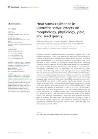 Cultivated crops are increasingly exposed to episodes of extreme heat. In the Mediterranean basin, crops often experience heat stress during spring or summer, coinciding with flowering and seed ripening. Recently, Camelina sativa has emerged as an alternative oilseed crop of interest due to its resistance to abiotic stresses. To investigate possible mechanisms underlying camelina’s ability to cope with heat stress and to evaluate the role of tocopherols, two spring varieties (Cypress and Omega) were tested in two controlled-environment experiments. Heat was imposed for five consecutive days either from the end of flowering (EXP1) or from the stage when siliques reached their final size (EXP2). Early imposition of heat stress (EXP1) had the greatest impact on camelina morphological parameters during the growth cycle. At harvest in EXP1, only the genotype significantly affected plant height and seed yield, with Omega producing taller plants and higher seed yield (0.83 g per plant) compared with Cypress (0.70 g per plant). In EXP2, cultivar significantly affected only straw weight, which was higher in Omega. Nonetheless, Cypress exhibited the highest 1,000-seed weight in both experiments (1.36 g in EXP1 and 1.34 g in EXP2). Seed oil content was reduced by heat stress (− 9.89% in EXP1 and − 11.6% in EXP2, respectively). Fatty acid composition in EXP1 was mainly influenced by the cultivar, except for C18:1, whereas in EXP2, heat stress predominantly affected 18-carbon fatty acids. Total tocopherol content was largely under genetic control, and although α-tocopherol is associated with responses to abiotic stress, it increased only when stress was imposed at a later stage (+ 75.8% in the stressed plants). Despite the high tocopherol content of camelina, it appeared to contribute to plant stress resistance only under late-stage heat stress dueing seed maturation.