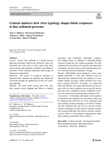 Context Excess fine sediment is a global stressor affecting freshwater biodiversity. However, little consideration has been given to how large-scale landscape controls and temporal variability may influence the effect of fine sediment deposition and storage on biological communities. Objectives We assess if ecological responses to deposited fine sediment are spatially and temporally consistent through the application of the river typology approach. Methods We used 2,940 records from 391 wadable streams across England and Wales to identify taxonomic and functional community composition change points, in addition to individual family responses along the fine sediment gradient. We also examined the association of taxonomic and functional community diversity metrics and biomonitoring metrics with deposited fine sediment coverage. Results Mid-altitude rivers displayed a lower community threshold (~ <10% fine sediment cover) of deposited fine sediment before the majority of community change occurred, whilst lowland rivers were more tolerant (20-25%). Critically, we found that both mid-altitude river types demonstrated no association with two fine sediment stressor-specific metrics and that some community metrics displayed a positive association with increasing fine sediment cover. Conclusions Community and family level responses to deposited fine sediment are non-linear, which can be characterized effectively by river typologies and most notably altitude groupings. Low levels of deposited fine sediment may not act as a stressor in mid-altitude catchments as these may be resource limited. Our research underlines the need to consider context-specific effects of fine-grained sedimentation rather than seeking to generalise stressor effects.