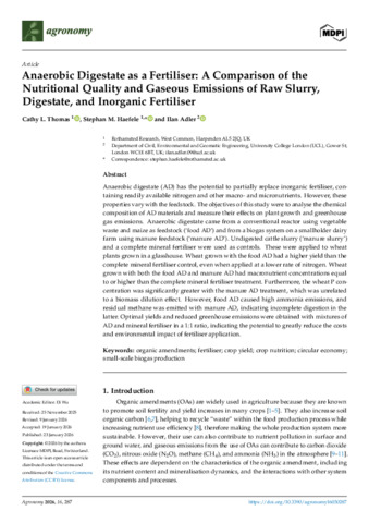 Anaerobic digestate (AD) has the potential to partially replace inorganic fertiliser, containing readily available nitrogen and other macro- and micronutrients. However, these properties vary with the feedstock. The objectives of this study were to analyse the chemical composition of AD materials and measure their effects on plant growth and greenhouse gas emissions. Anaerobic digestate came from a conventional reactor using vegetable waste and maize as feedstock (‘food AD’) and from a biogas system on a smallholder dairy farm using manure feedstock (‘manure AD’). Undigested cattle slurry (‘manure slurry’) and a complete mineral fertiliser were used as controls. These were applied to wheat plants grown in a glasshouse. Wheat grown with the food AD had a higher yield than the complete mineral fertiliser control, even when applied at a lower rate of nitrogen. Wheat grown with both the food AD and manure AD had macronutrient concentrations equal to or higher than the complete mineral fertiliser treatment. Furthermore, the wheat P concentration was significantly greater with the manure AD treatment, which was unrelated to a biomass dilution effect. However, food AD caused high ammonia emissions, and residual methane was emitted with manure AD, indicating incomplete digestion in the latter. Optimal yields and reduced greenhouse emissions were obtained with mixtures of AD and mineral fertiliser in a 1:1 ratio, indicating the potential to greatly reduce the costs and environmental impact of fertiliser application.