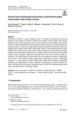 Extreme heat and drought at flowering could threaten global wheat yields under climate change