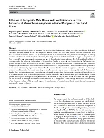 Sternochetus mangiferae is a pest of mangoes, occurring worldwide in regions where mangoes are cultivated. In Brazil, this insect was first detected in 2014 in Seropédica, Rio de Janeiro, and since then, various measures and studies have been conducted to contain, monitor and potentially eradicate it. Semiochemicals may provide feasible targets to develop sensitive detection and monitoring tools. Therefore, this study aimed to evaluate whether S. mangiferae use pheromones from conspecifics and kairomones from mango tree host in their chemical communication. The findings identify a blend of mango volatiles that influence the behaviour of S. mangiferae females. A synthetic blend containing the EAD-active compounds γ-butyrolactone, benzaldehyde, 6-methyl-5-hepten-2-one, myrcene, (Z)-ocimene, 2-methoxyphenol, (S)-linalool, methyl salicylate and methyl benzoate was attractive to females of S. mangiferae from Ghanaian and Brazilian populations in two-choice olfactometry experiments. The results also indicate that the absolute configuration of linalool in the mango synthetic blend is crucial for female attraction, as females respond only to blends containing (S)-linalool. Furthermore, females from both populations were attracted to the odour of live males from their respective localities. Chemical analysis of aeration samples from the Brazilian population revealed that males and females emitted qualitatively similar volatile profiles. Although no male-specific compounds could be identified to fully explain female attraction, this study provides the first evidence of intraspecific chemical communication in S. mangiferae. These findings advance our understanding of the chemical ecology of this pest and support the development of semiochemical-based monitoring and management strategies for mango orchards.