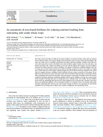 This study assessed the effects of different urea-based fertilisers on nutrient leaching, wheat yield and nitrogen (N) use efficiency (NUE) in two clayey, alkaline soils from Morocco and two sandy, acidic soils from Nigeria. The study was carried out in a controlled environment room under optimum conditions. Columns of the soils were sown with spring wheat, treated with different urea-based fertilisers applied basally and on the soil surface, and leached four times with a dilute salt solution. In the soil with the highest soil N supply, all of the fertilisers increased N leaching compared to when no fertilisers were applied. Furthermore, including inhibitors with urea or having urea in a slow-release format did not affect N leaching compared to when N was applied as straight urea. In soils with lower soil N supply, applying straight urea did not affect N leaching compared to the control with no N applied. However, including a urease inhibitor with urea caused an increase in N leaching. The inhibitor may have allowed the urea to penetrate deeper into the soil before being hydrolysed, decreasing ammonia (NH3) volatilisation losses from the soil surface and increasing the concentration of mobile N below the root zone available for leaching. Including a nitrification inhibitor with the urease inhibitor or having urea in slow-release format brought N leaching back down to background levels. Although yields were similar, the dual inhibitor proved better for maintaining NUE than the slow-release fertiliser in two of the four soils. Therefore, urea with a urease and nitrification inhibitor is the reccomended fertiliser for reducing N losses via leaching while simultaneously maintaining NUE. However, the extent of these changes are likely to vary depending on experimental conditions such as seeding rates, fertiliser rates, method of application and experimental set-up.