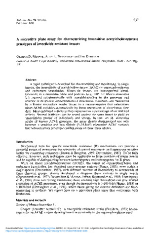 A microtitre plate assay for characterizing insensitive acetylcholinesterase genotypes of insecticide-resistant insects.