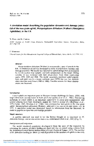A simulation model describing the population dynamics and damage potential of the rose grain aphid, Metopolophium dirhodum (Walker)(Hemiptera: Aphididae), in the UK.