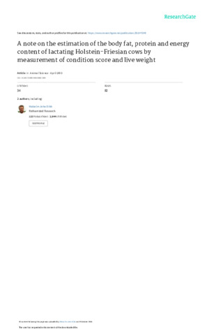 A note on the estimation of the body fat, protein and energy content of lactating Holstein-Friesian cows by measurement of condition score and live weight.