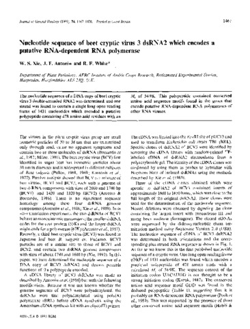 Nucleotide sequence of beet cryptic virus 3 dsRNA2 which encodes a putative RNA-dependent RNA polymerase
