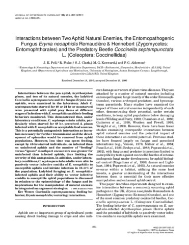 Interactions between two aphid natural enemies, the entomopathogenic fungus Erynia neoaphidis Remaudiere & Hennebert (Zygomycetes: Entomophthorales) and the predatory beetle Coccinella septempunctata L. (Coleoptera: Coccinellidae).