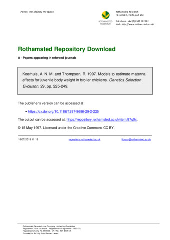 The estimation of genetic and environmental maternal effects by restricted maximum likelihood was considered for juvenile body weight (JBWT) data on 139 534 and 174 668 broiler chickens from two populations. Of the biometrical models usually assumed in the estimation of maternal effects (’reduced Willham’ models), a genetic model allowing for direct and maternal genetic effects with a covariance between them and a permanent environmental maternal effect provided the best fit. The maternal heritabilities (0.04 and 0.02) were low compared to the direct heritabilities (0.32 and 0.27), the direct maternal genetic correlations (A)Mr were negative and identical for both strains (- 0.54) and environmental maternal effects of full sibs (0.06 and 0.05) were approximately a factor of two greater than maternal half sibs (0.03 and 0.02). A possible environmental dam-offspring covariance was accounted for in the mixed model by (1) estimation of the covariance between the environmental maternal and the environmental residual effects (E)Cc and (2) a maternal phenotypic effect through regression on the mother’s phenotype (,mF ’Falconer’ model). Whilst increasing the likelihoods considerably, these extended models resulted in somewhat more negative A rM values owing to positive estimates of CEC (0.04-0.08 and 0.03-0.09) and Fm (0.01-0.14 and 0.01-0.11). A more detailed fixed effects model, accounting for environmental effects due to individual parental flocks, reduced estimates of A rM (- 0.18 to - 0.33). Results suggested a limited importance of maternal genetic effects exerting a non-Mendelian influence on JBWT. The present integrated ’Falconer-Willham’ models allowing for both maternal genetic (co)variances and maternal action through regression on the mother’s phenotype in a mixed model setting might offer attractive alternatives to the commonly used ’Willham’ models for mammalian species (eg, beef cattle) as was illustrated by their superior goodness-of fit to simulated data.