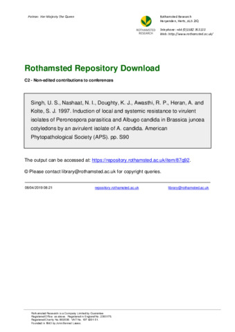 Induction of local and systemic resistance to virulent isolates of Peronospora parasitica and Albugo candida in Brassica juncea cotyledons by an avirulent isolate of A. candida.