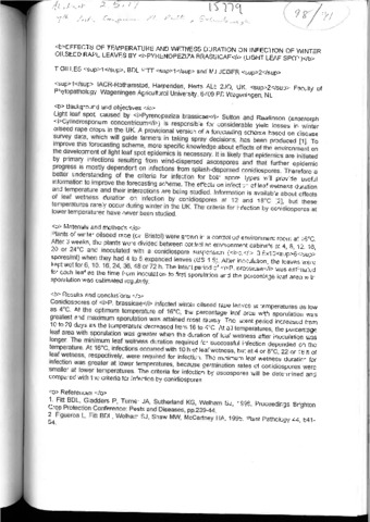 Effects of temperature and wetness duration on infection of winter oilseed rape leaves by Pyrenopeziza brassicae (Light leaf spot).