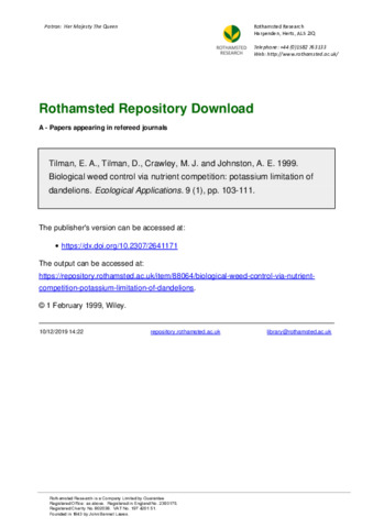 Weedy plants are often controlled by the application of herbicides. Here we explore an alternative method of control. We suggest that the abundance of an undesired plant species (here dandelions: Taraxacum officinale) may be controlled by modifying interspecific competition via changes in resource supply rates. This hypothesis is supported by several lines of evidence. First, analyses of effects of different patterns of fertilization on plant-species abundances in the 140-yr-old Park Grass Experiment at Rothamsted, England, show that Taraxacum abundances were highly dependent on potassium fertilization and on liming, but not on addition of other nutrients. Potassium fertilization led to a 17- to 20-fold increase in Taraxacum abundances in the classical Park Grass data, and to a 4- to 7-fold increase in the modern data. Liming led to a 2- to 3-fold increase for classical data and to a 3- to 4-fold increase for modern data. Second, in a greenhouse study in Minnesota, Taraxacum had a higher requirement for potassium and had its biomass more limited by potassium than any of five common grass species of Park Grass. This suggests that Taraxacum may be a poorer competitor for potassium than these grasses, but this mechanism has not yet been tested. Third, in a series of Minnesota lawns that had not received fertilizer or herbicides, both Taraxacum density and abundance were significantly positively correlated with its tissue potassium levels. This demonstration that desired and weedy plant species can differ in their resource requirements suggests that adjustments in resource supply rates may determine the outcome of interspecific competition, allowing desired species to competitively control weedy species. In particular, for soils with low potassium levels, the use of potassium-free lawn fertilizer is predicted to decrease Taraxacum because of competition from grasses like Festuca rubra.